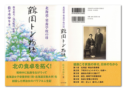 『北海道・栄養学校の母 鶴岡トシ物語』が出版されましたので、簡単にご紹介します。 表題には、北海道栄養学校の母「鶴岡トシ物語」と記され、黄色の帯には、北の食卓を拓く!戦時中に私財をなげうって、北海道女子栄養学校(現・北海道文教大学)を創設した明治女のパワフル人生記と記載されているこの本の見開きには、『現在、食料自給率約200%を誇る北海道。